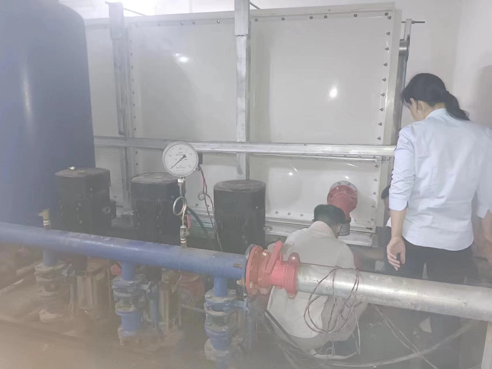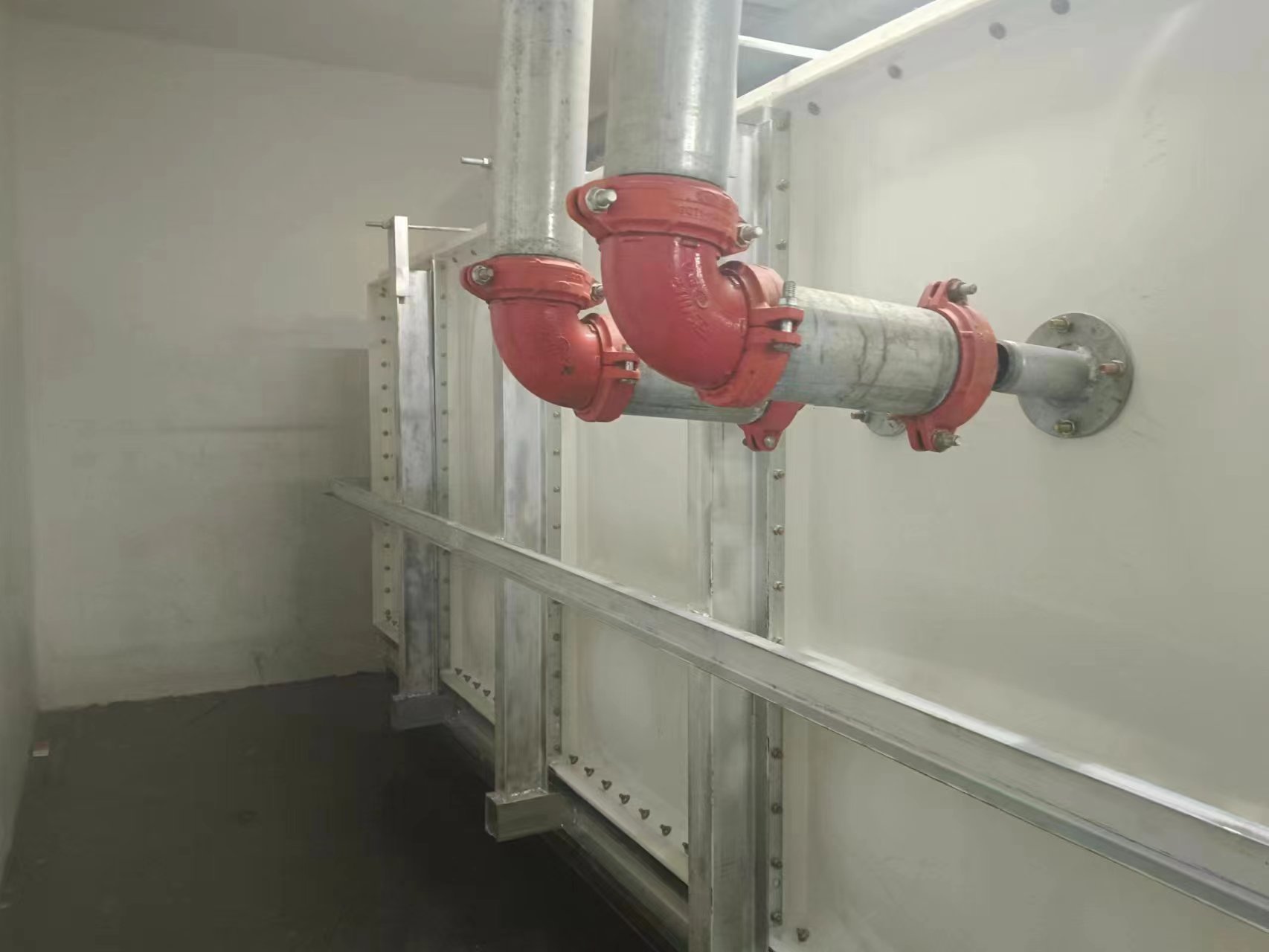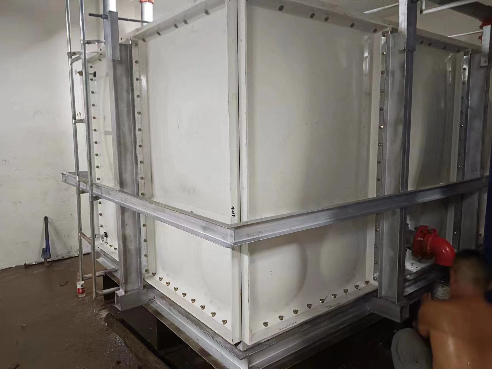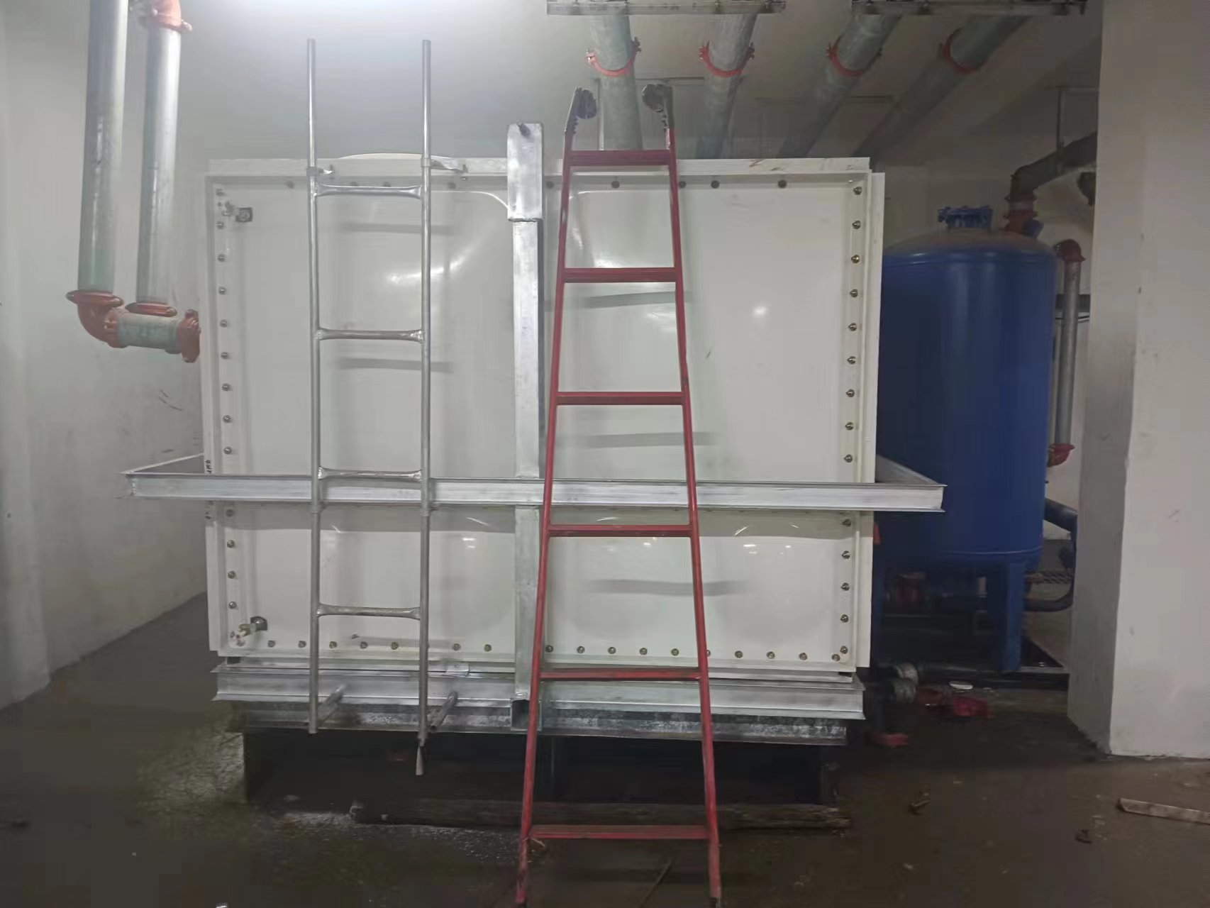 由于使用環境及使用介質所限,有些水箱內部盛有高濃度溶液,如:濃鹽水、海水等,對水箱內壁鋼板會有嚴重腐蝕,因此無法采用不銹鋼水箱或者鋼板水箱。正常玻璃鋼水箱板可以耐腐蝕,但是水箱內部又設有鋼制拉筋支撐等,故此也不適用以上介質使用。為了滿足特殊用戶的使用需求,經過承重及承壓測試后,這種無內件玻璃鋼水箱面世,它采用不同規格(1000*1000mm、1000*500mm、500*500mm)的玻璃鋼模壓板組裝,水箱內部沒有設任何鋼制配件,水箱外部及底部采用工字鋼加固,所有法蘭采用ABS材質俗稱塑料材質,外觀整潔無變形,內部無配件,易清洗、維護方便,延長了水箱的使用壽命,滿足特殊用戶的特殊需求。
